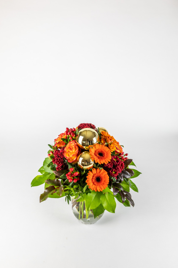 Orange-rote Farben, welche durch Ihre wärmende Wirkung eine weihnachtliche und heimelige Stimmung vermitteln. Wenn dieser Strauß einen Raum schmückt fühlt man sich geborgen. Dank Rosen, Germini, Sanitni, Hypericum und Kugeln.
