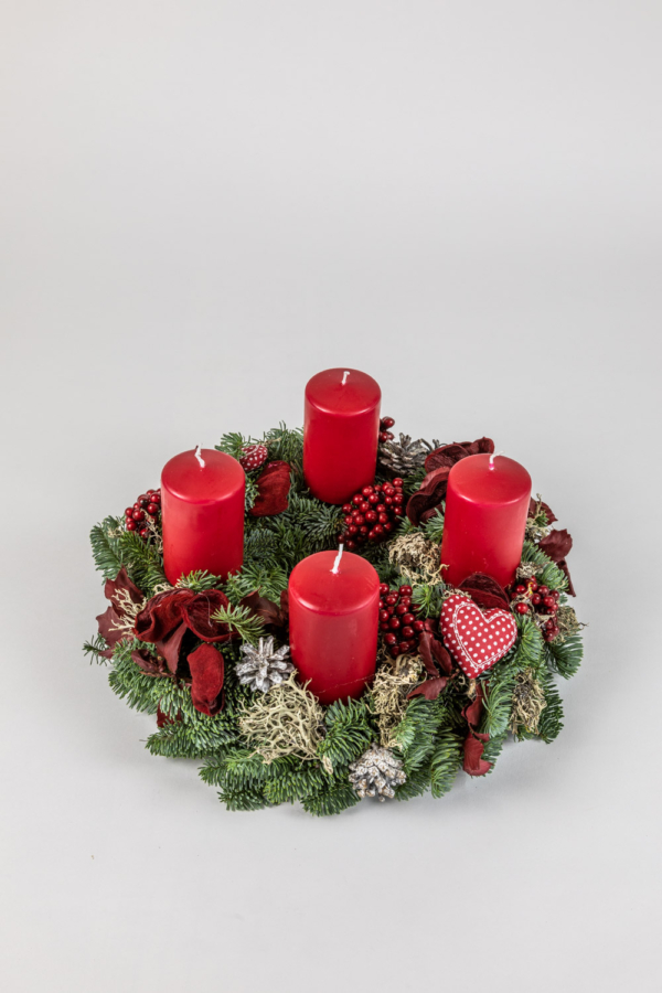 Wir präsentieren Ihnen unseren Klassiker unter den Adventkränzen, wir verwenden hierfür eine Strohunterlage mit Nobilis oder gemischtem Koniferengrün gewickelt. Geschmackvoll dekoriert mit weihnachtlichem Schmuck für ein besonderes Fest Zuhause. Unsere Kerzen befestigen wir mit einem Draht auf der Grünunterlage und gewähren somit einen stabilen und sicheren Transport. Bei Ihnen Zuhause heißt es dann, einfach genießen.