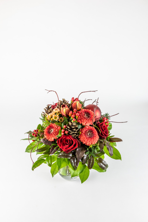 In diesem Bouquet kommen klassische Farben und Materialien zusammen um von Herzen „Frohe Weihnachten“ zu sagen. Dafür verwenden wir bewährte Blüten wie die Amaryllis, Germini, Rosen und Beeren, sowie dazu passende Zapfen und Kugeln.